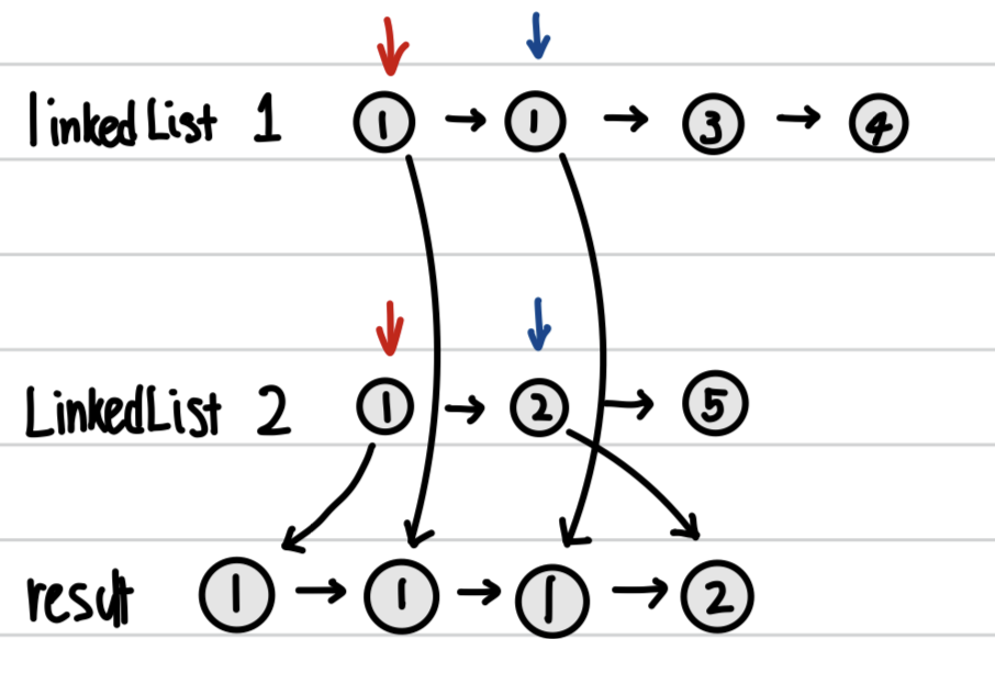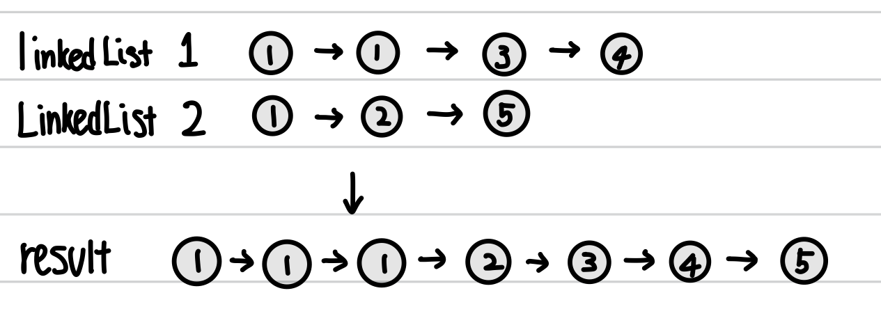 2 LinkedList를 비교하여 작은수를 result라는 linkedList의 tail에 next값으로 넣어주고,